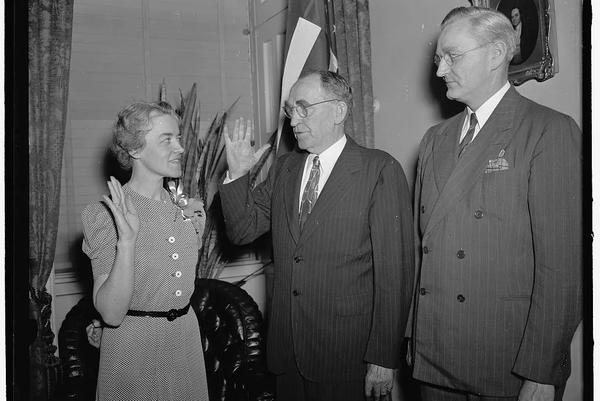 Margaret Chase Smith, wife of the late Rep. Clyde Smith, Republican, of Maine, is sworn in to fill the