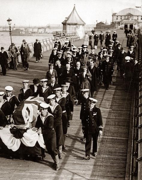 The body of Edith Cavell carried from the wharf at Dover. Her memorial service was held in Westminster Abbey, London. She was buried at Life's Green, near Norwich